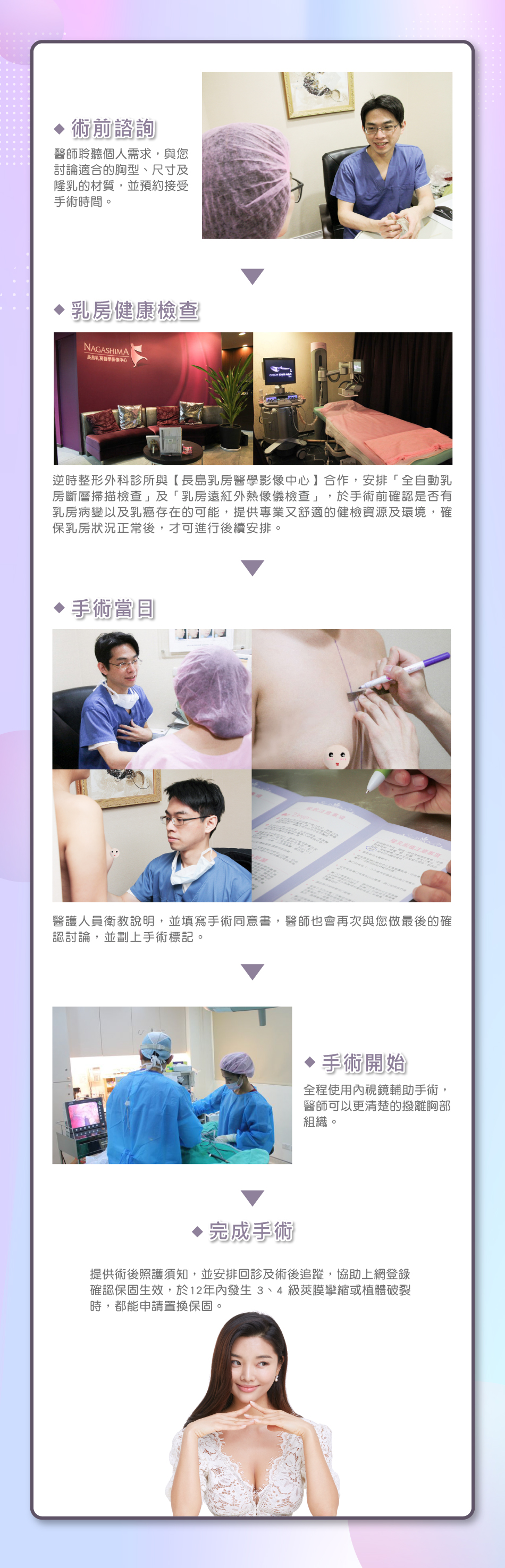1、需年滿 22 歲以上的婦女使可接受隆乳手術。隆乳包含首次隆乳手術來增加乳房的尺寸,以及修復手術來修正或改良首次隆乳手術的結果。