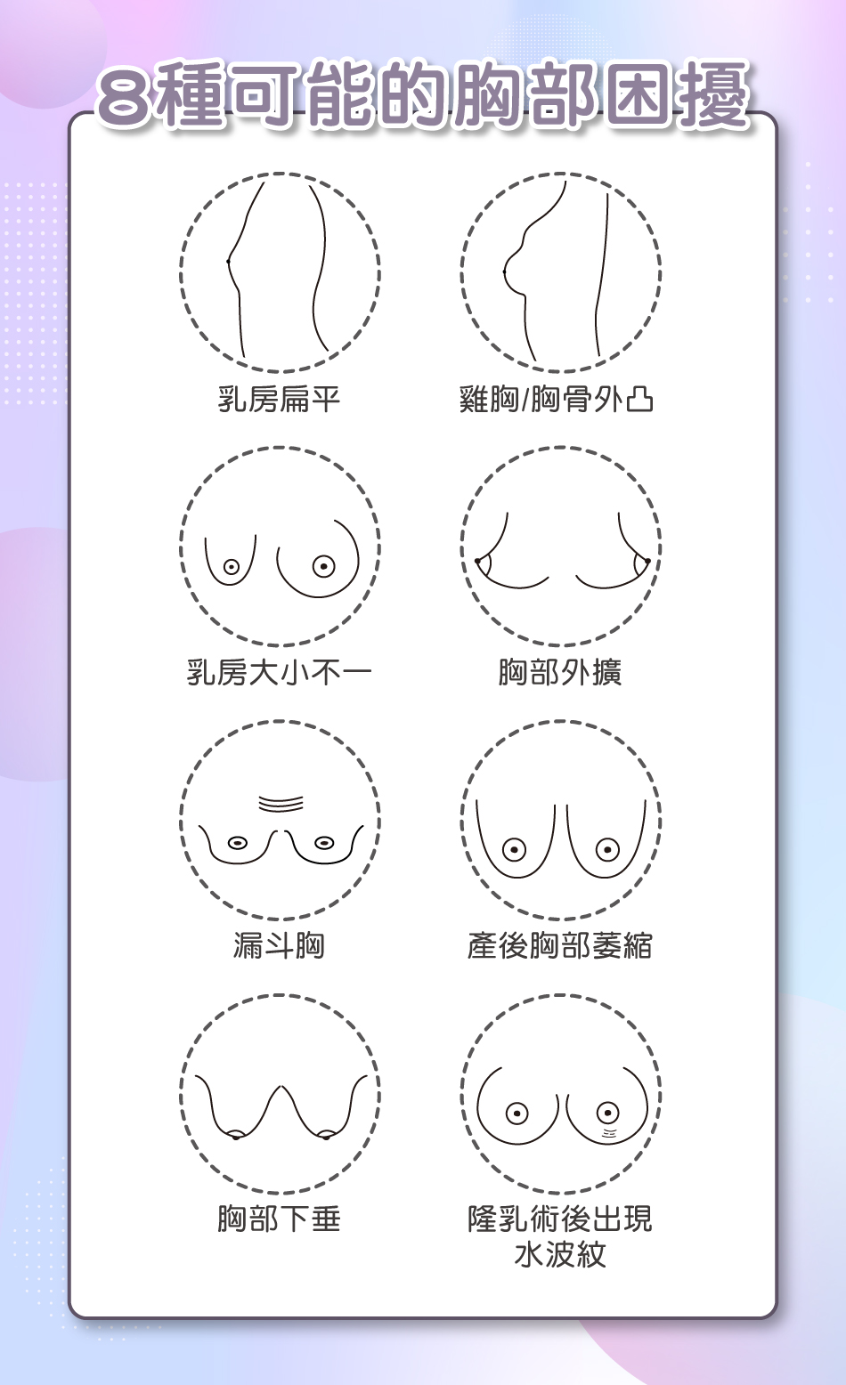 妳,對自己的胸型滿意嗎?較常見的胸型困擾像是外擴、下垂、雞胸、扁平胸,或是因產後或減肥所造成的乳房萎縮、鬆軟,都是女性最想改善的胸型問題!由此可知,不只是大小,胸部形狀和堅挺度也是理想胸型的關鍵!