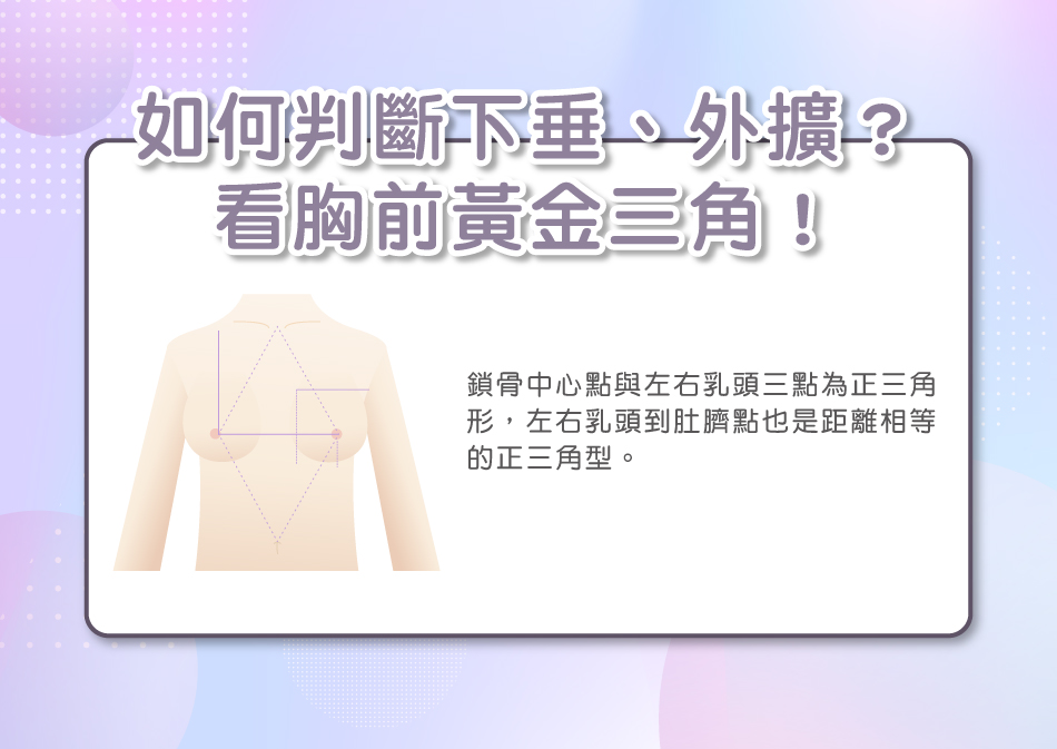 ●觀察兩邊乳房的距離是否落在15-19 cm間,當鎖骨中心點與乳頭兩點連線過寬呈現較扁的等腰三角形時,代表胸部有外擴的可能。