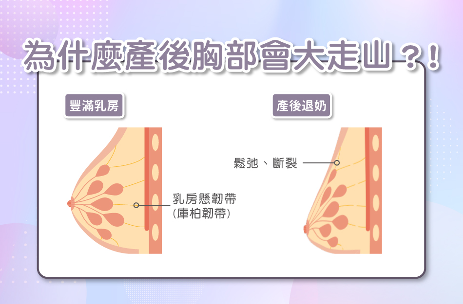 主要是因為乳腺被過度使用,反覆的脹奶、退奶,導致庫柏氏韌帶因延展而斷裂,組織慢慢失去彈性而變得鬆弛、造成上胸較扁。且產後乳房重量提升,也可能使締結組織因地心引力造成拉扯,因此除了胸部萎縮,還會伴隨著胸部下垂的情形。