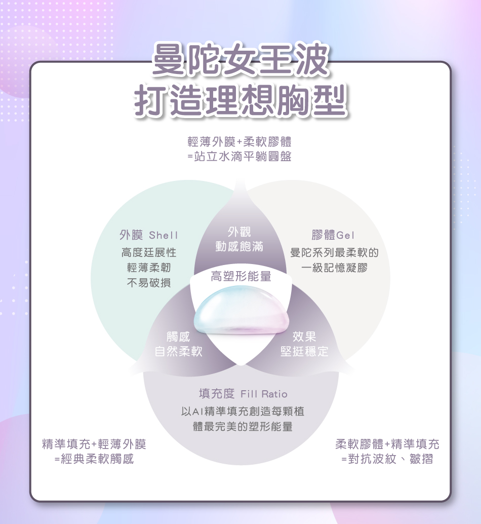 曼陀女王波以柔軟度為前提,透過AI精準運算適合的填充量,外膜輕薄柔韌,膠體柔軟波動,成就兼具柔軟與飽滿的植體,避掉因增加填充,就得減少柔軟性的狀況。簡言之,AI能精準填充、高度塑型,精密計算每顆植體的最佳柔軟度,同時蘊含飽滿的塑形能量,維持外膜、膠體、填充,三項工藝平衡的理想比例。