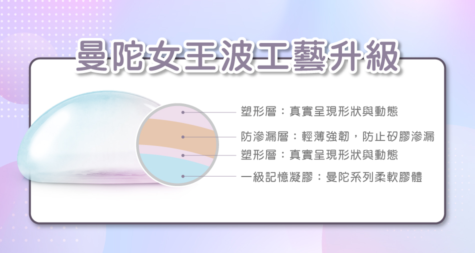 因此曼陀女王波的效果不僅可以顯得飽滿,有效撐起胸型,同時也能減少邊緣感,不易產生波紋皺摺,提升植入穩定性,降低併發症機率。