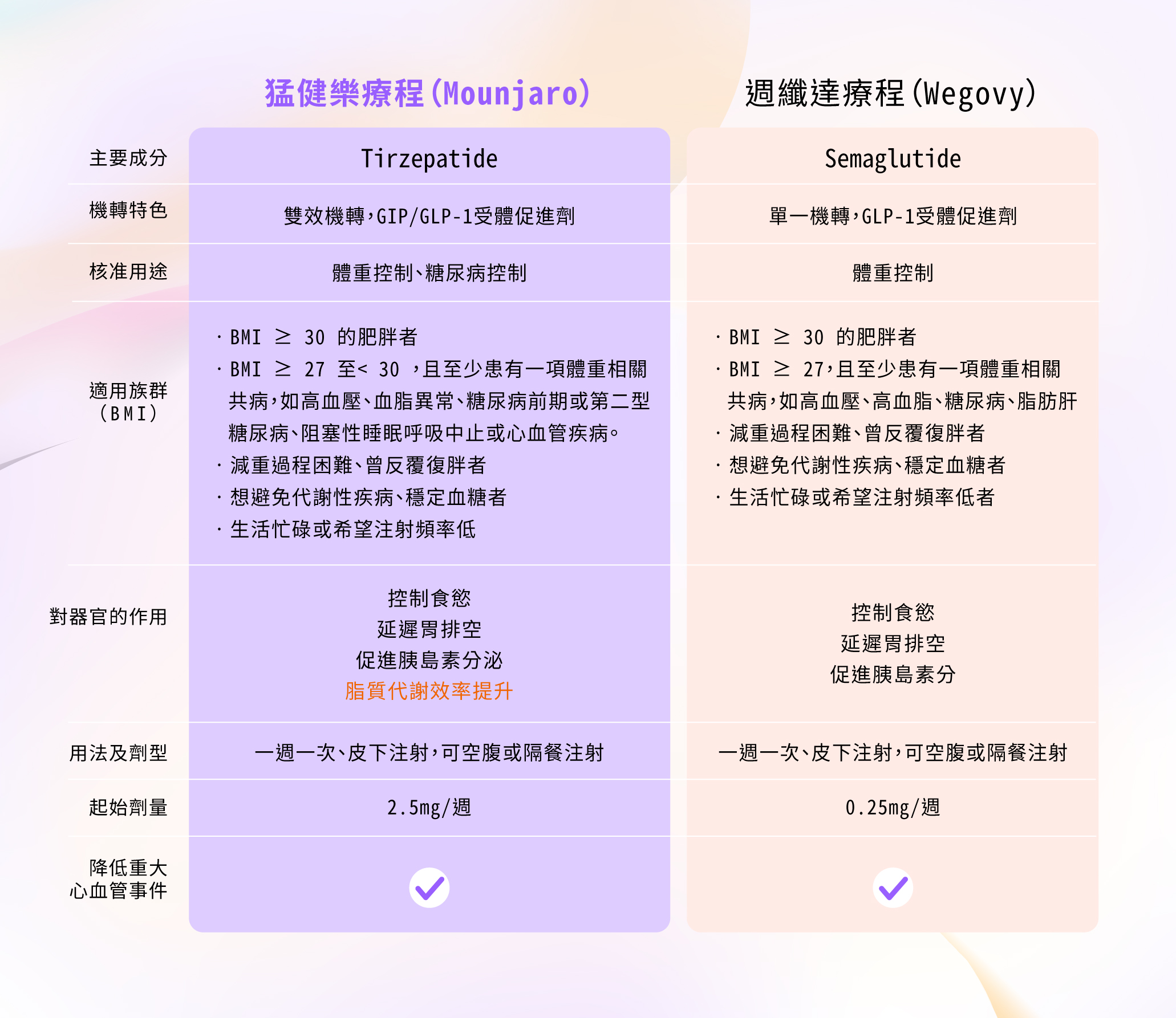 猛健樂療程(Mounjaro)及週纖達療程(Wegovy)為目前注射型減重療程中劑量較高,且使用頻率低(一週只需要打一次),更是通過台灣衛福部核准,適用於體重控制的減重注射劑!由醫師專業建議與臨床數據支持,猛健樂療程(Mounjaro)能更有效幫助患者控制體重,不過因個人體質和身體狀況不同,在進行療程前須先由專業醫師諮詢問診,經評估再進行療程安排,才能確保整體療程規劃適合自身狀況。