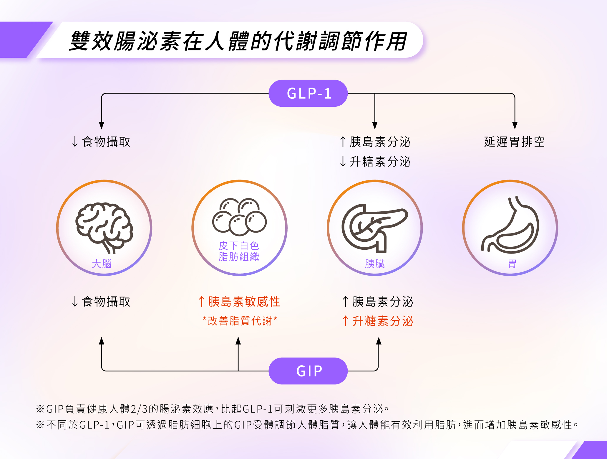 結合 GLP-1 與 GIP 兩種腸泌素雙重作用,從多重代謝路徑著手,幫助調節食慾並加速脂肪分解,有效突破減重瓶頸。