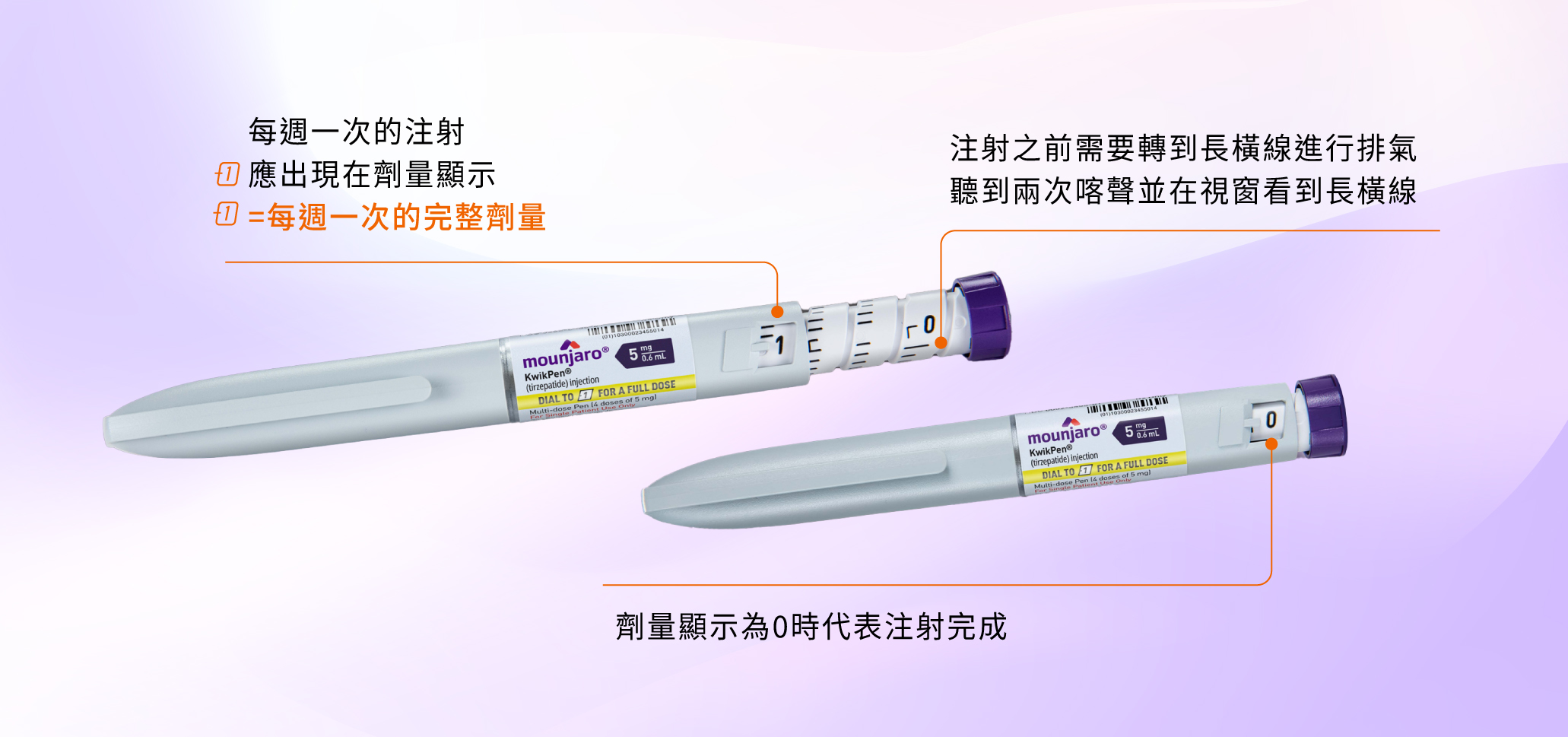 猛健樂療程(Mounjaro) 以 KwikPen 筆型提供,每支KwikPen 含有4個固定劑量,每週使用1劑,可使用四週。