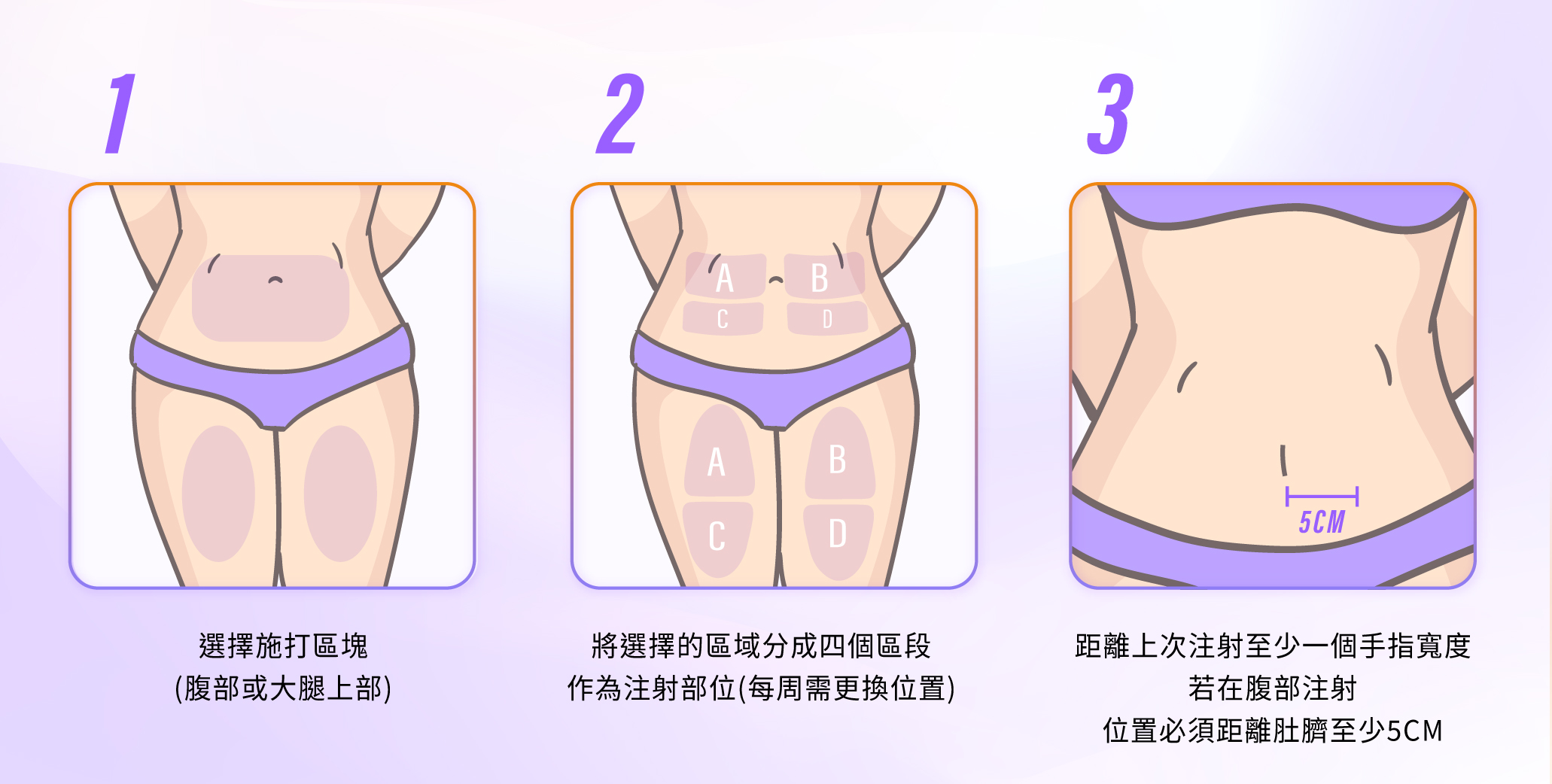 STEP3:距離上次注射至少一個手指寬度,若在腹部注射,位置必須距離肚臍至少5CM
