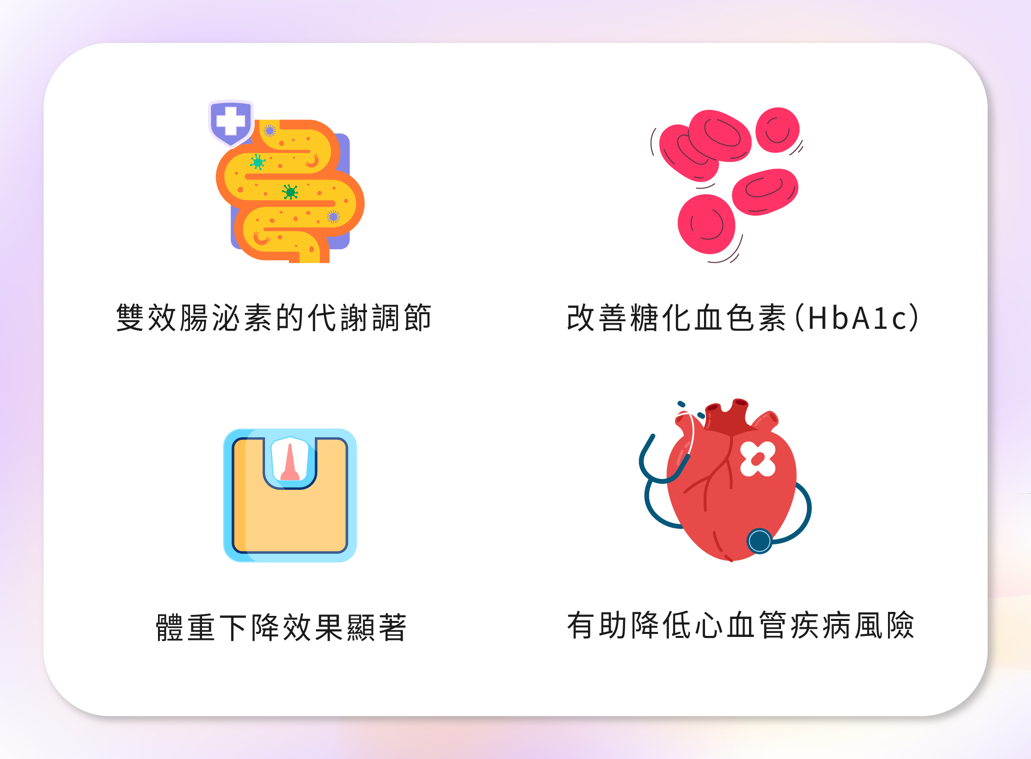 透過穩定血糖與改善胰島素阻抗,降低糖化血色素指數,對第二型糖尿病與「胖糖症」患者特別有幫助,進一步減少高血糖對血管與神經系統的傷害。