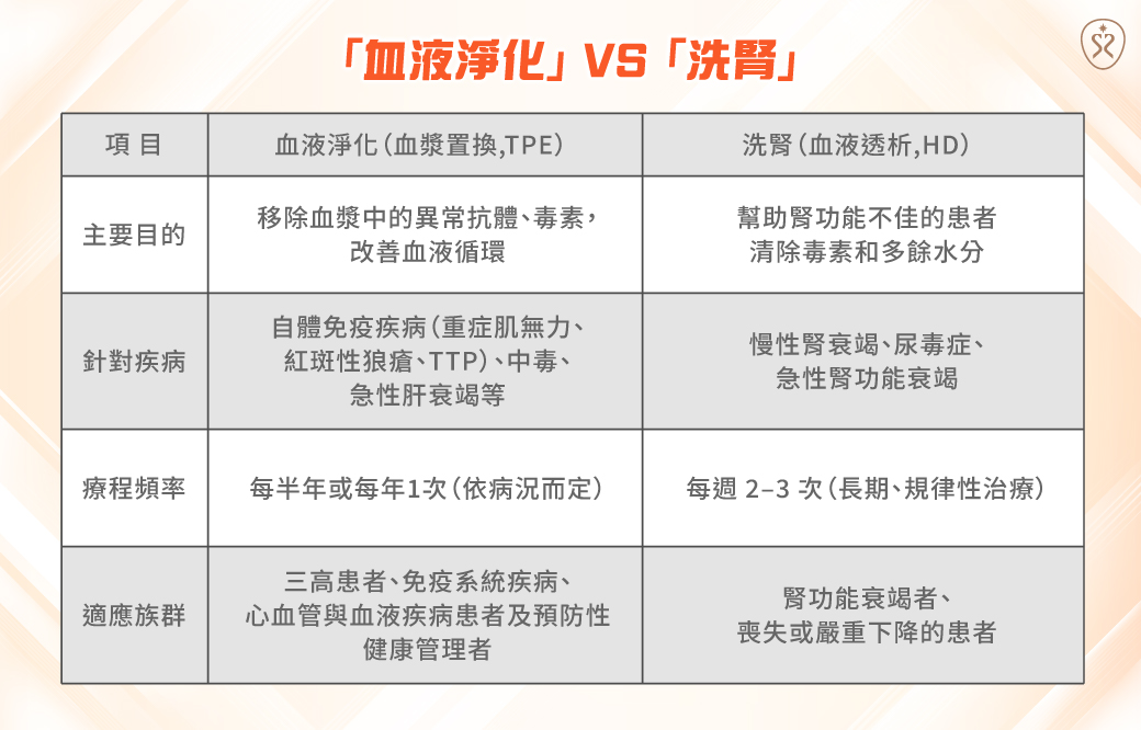 雖然「血漿置換術」與「洗腎」都屬於「血液淨化療程」,透過體外循環改善健康,但針對的疾病、清除物質與治療目標完全不同。