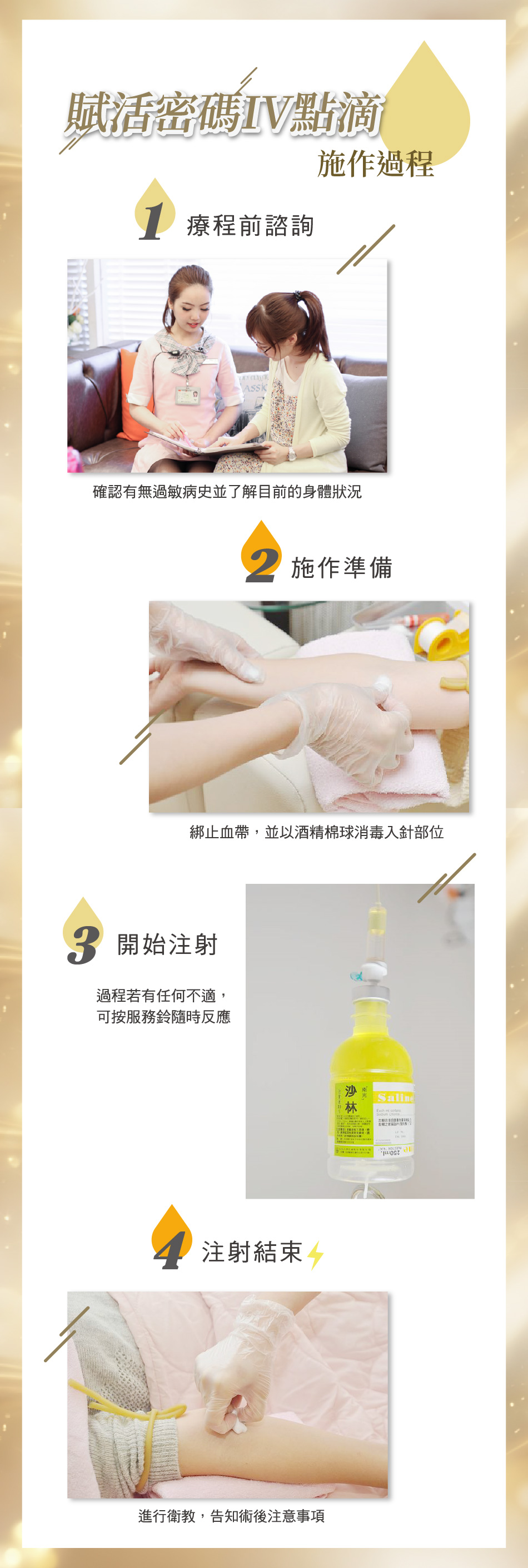 ※本頁面資訊為賦活密碼IV療程之衛教與療程說明,所有內容僅供了解課程性質與流程,並非用於診斷或治療疾病,亦不保證特定醫療效果。實際療程內容、成分組合與頻率,均由專業醫師依個人狀況評估後調整。