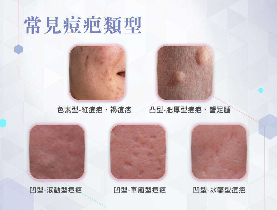 痘痘消掉後所留下的痘疤,分為凹疤、凸疤、紅疤、褐疤;褐色痘疤:基本上是一種色素沉澱,而不是真正的疤痕;紅色痘疤:因發炎後微血管擴張所致,是一種較輕的痘疤;凸痘疤:有可能是肥厚性的痘疤或蟹足腫,或與個人體質及之前痘痘長的部位有關;凹疤疤:則與個人體質、或是痘痘發炎太嚴重所致。