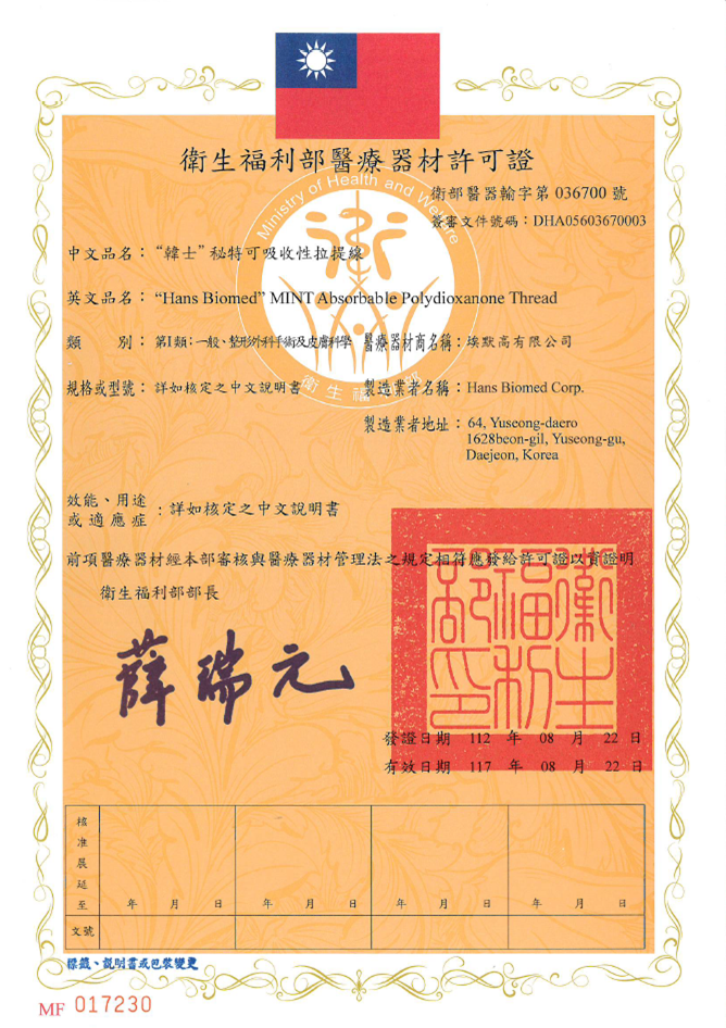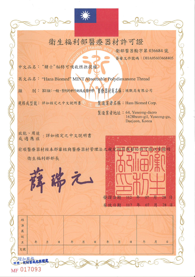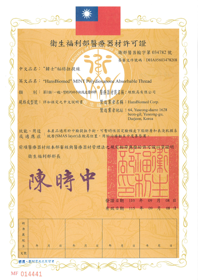 通過台灣衛生福利部食藥署(TFDA)認證,合法臉部用PDO可吸收拉提線材。