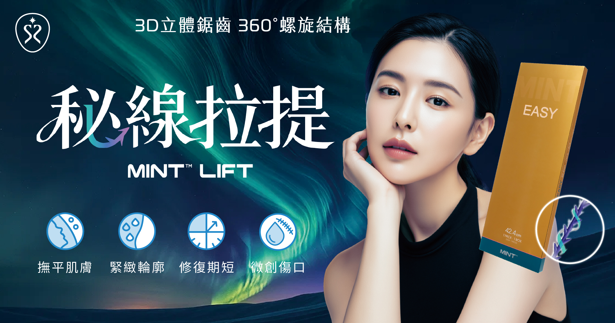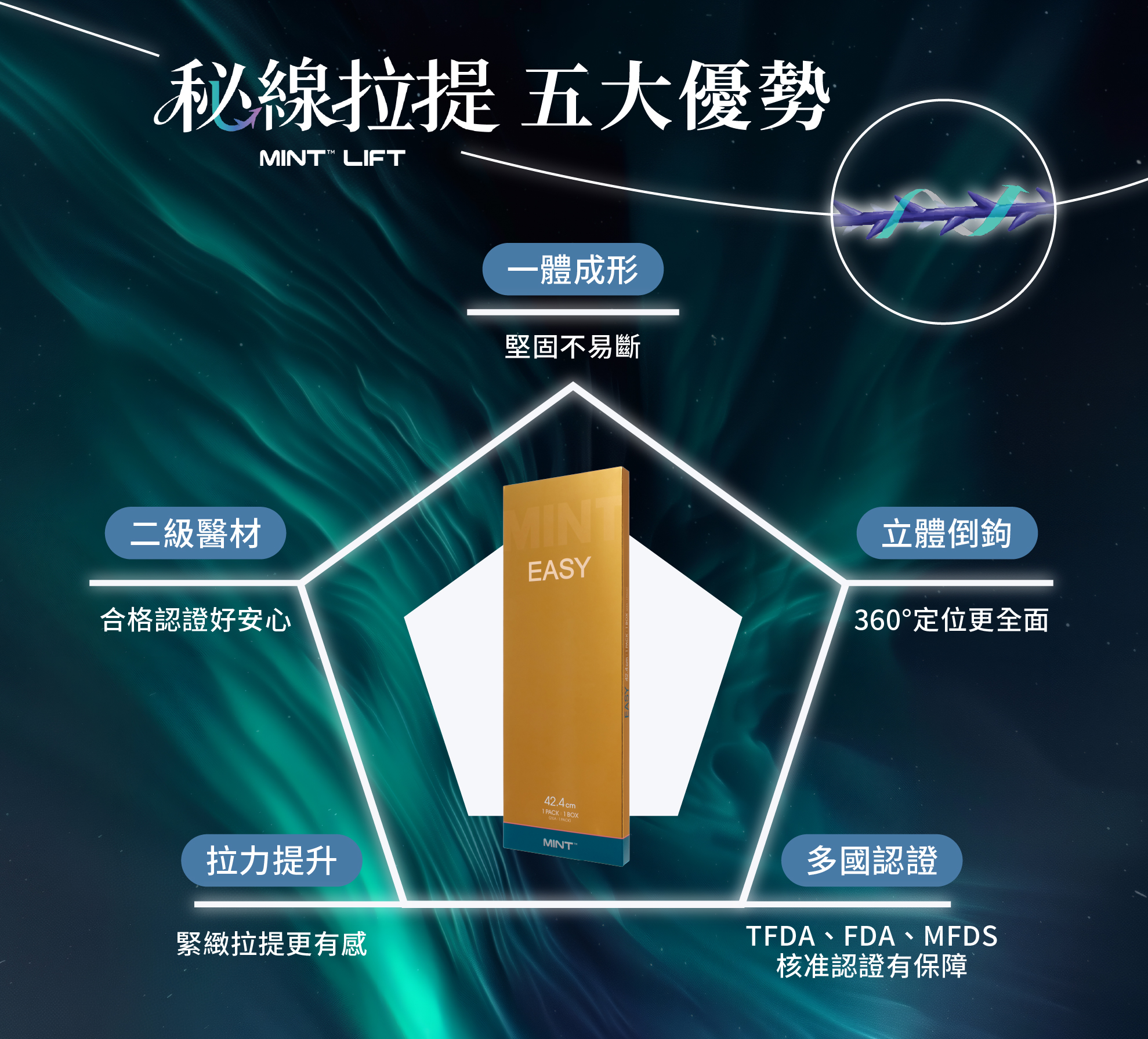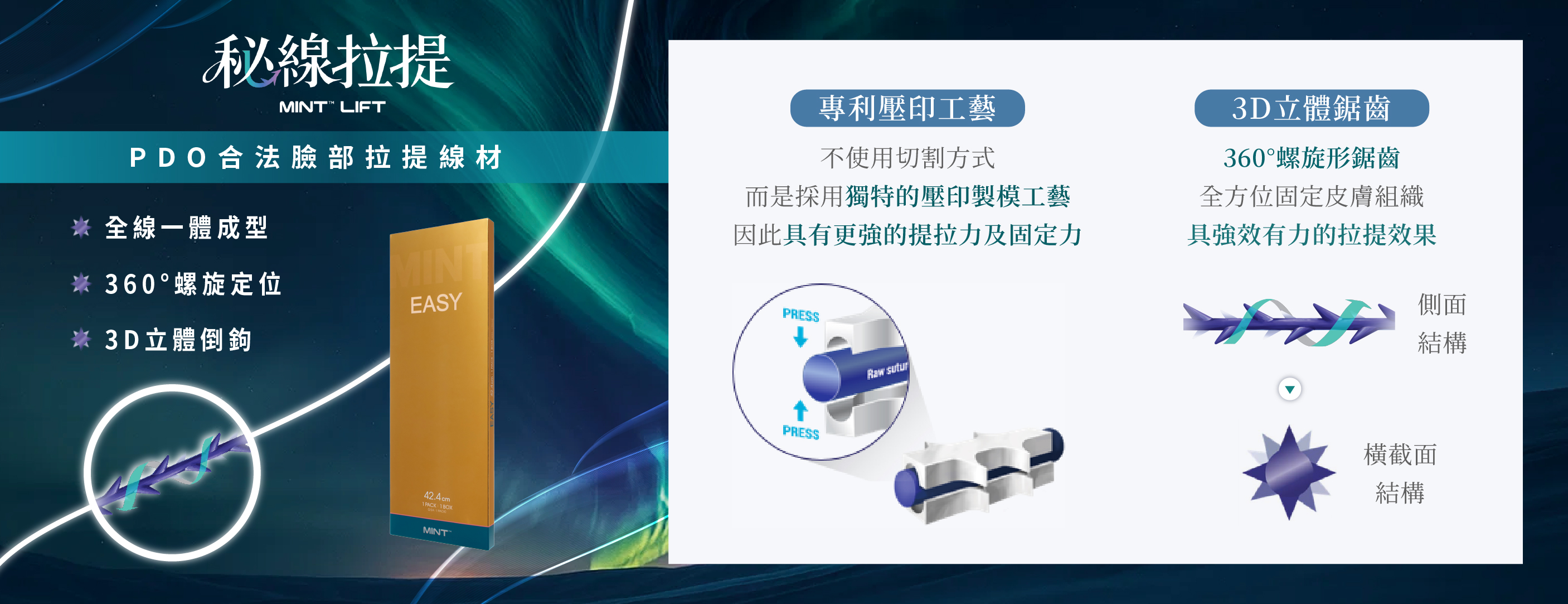 【MINT秘線拉提】是一種適用於中臉拉提手術的雙向可吸收拉提線材。利用微創技術將拉提線埋在髮際線內,傷口小且不明顯,並透過特殊設計的3D立體倒鉤能雙向360度拉提,均勻施力在皮下組織,使結締組織增生,使拉提效果更顯著。