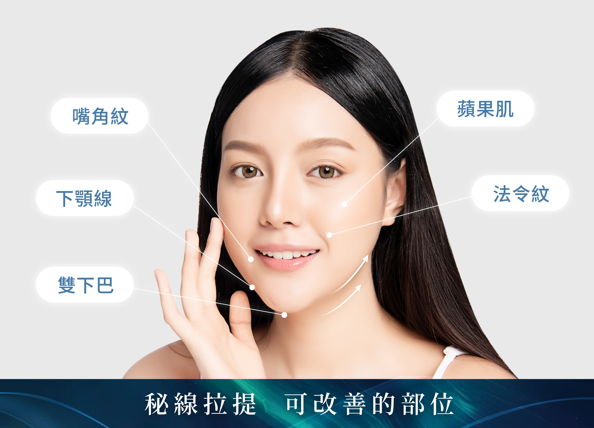 MINT秘線拉提打造緊緻輪廓線,改善因年齡產生的嘴邊肉、細紋等鬆垂問題,可改善部位:下顎線、蘋果肌、法令紋、嘴角紋(木偶紋)、雙下巴。