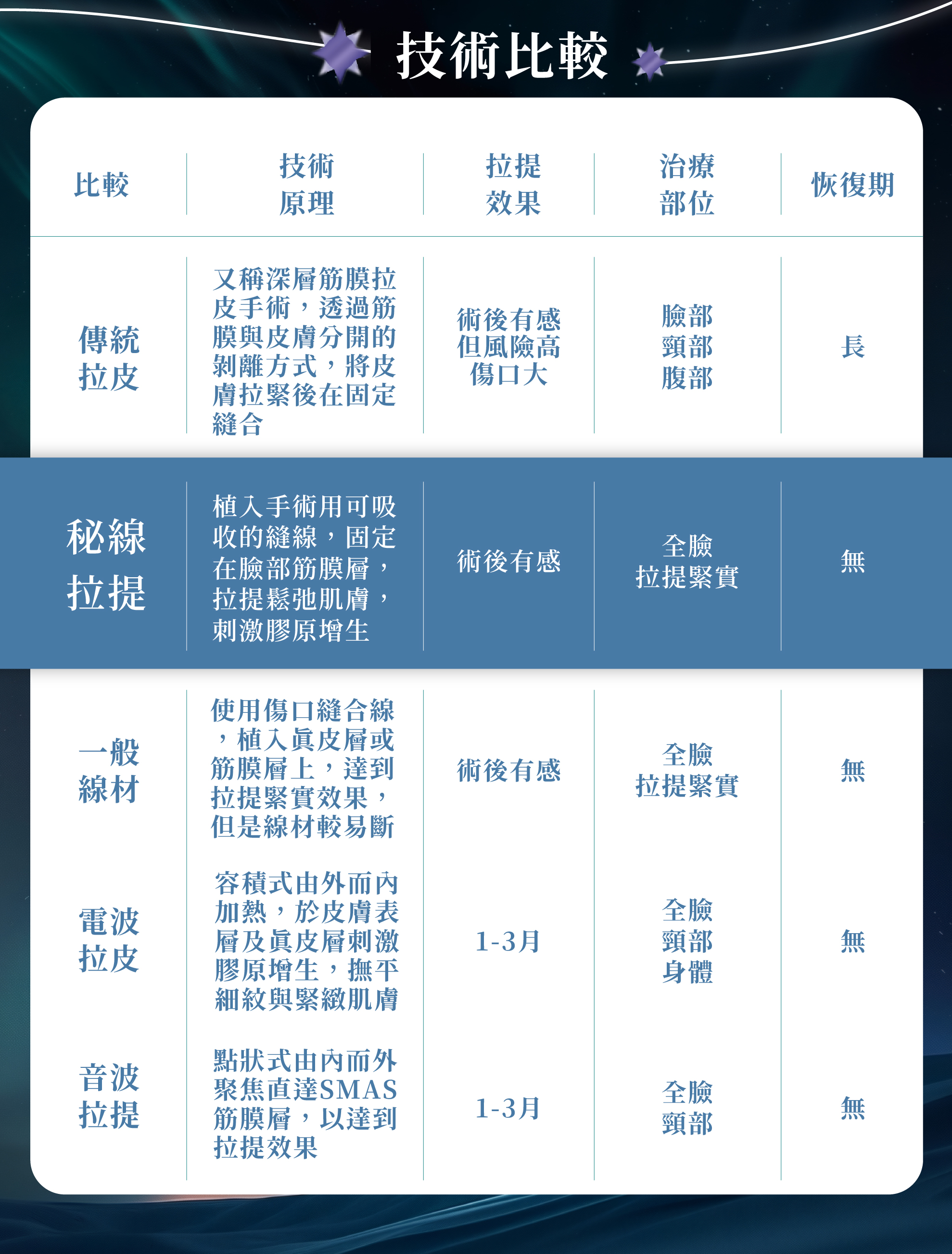 A:秘線拉提是新式微創拉提技術,因為傷口較細微,疼痛程度相對降低很多,加上術後恢復期短,幾乎是所有人都可以忍受的疼痛範圍。